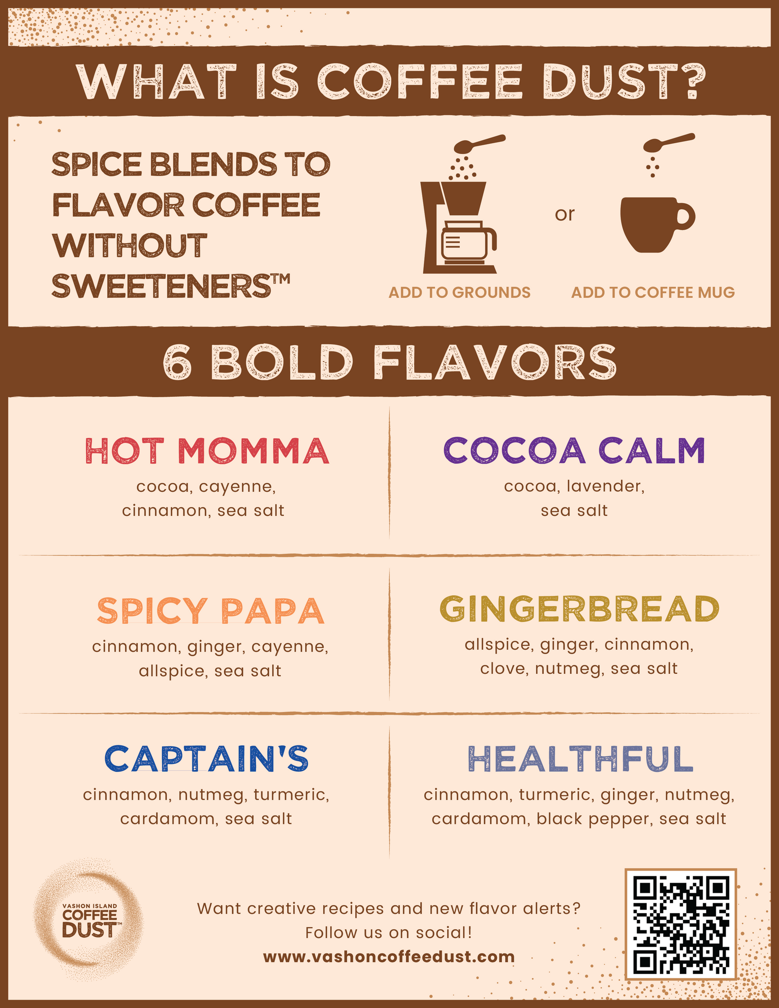 - Laminated sign to explain to your customers what Coffee Dust is and what their flavor options are